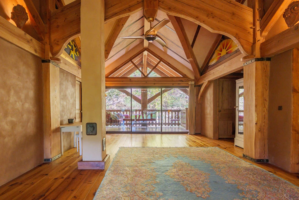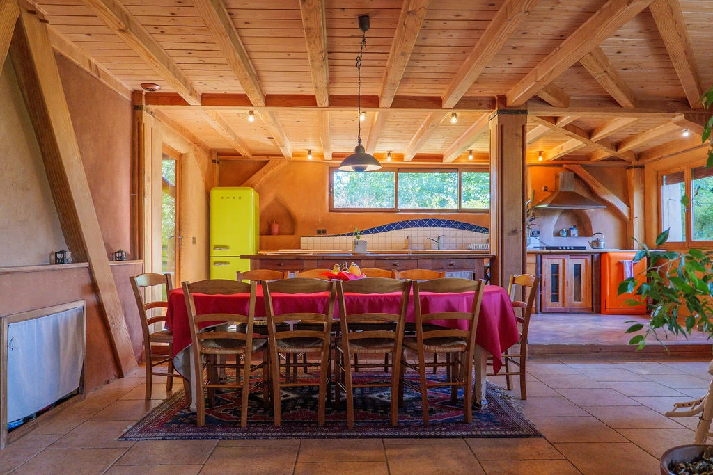 Dès l'abord, le bâtiment séduit par son architecture harmonieuse. Construit selon des techniques écologiques vertueuses, il marie une solide charpente en bois, des murs en paille et des enduits en terre. Cette construction confère au lieu une atmosphère particulière : une énergie douce et apaisante, propice au ressourcement et à l'introspection.