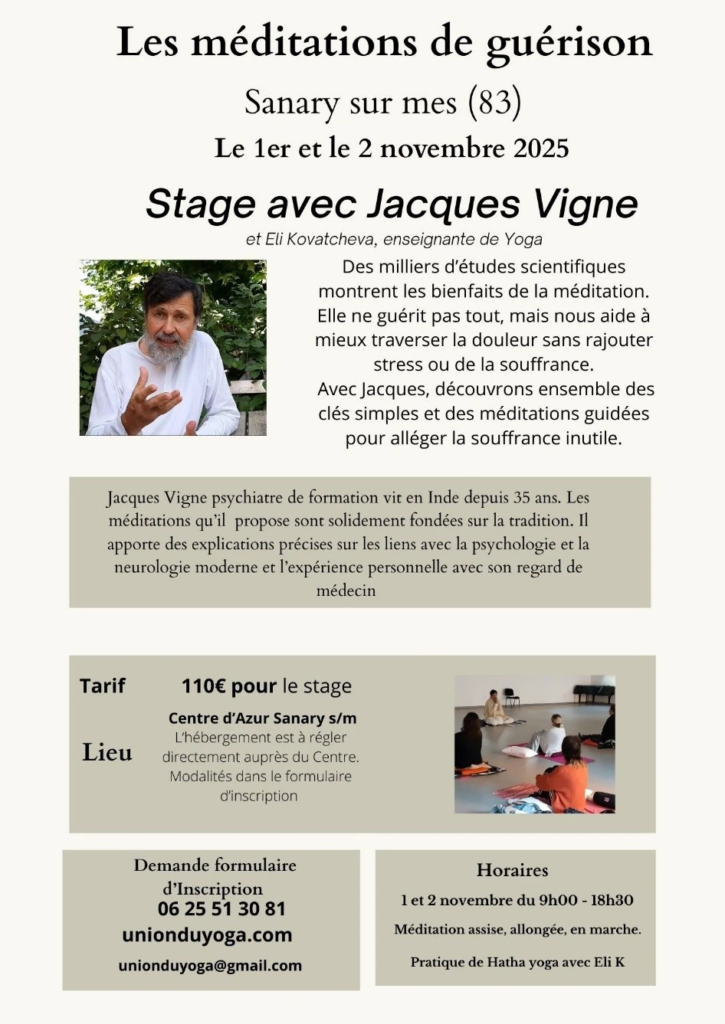 Nous en sommes à plus de 11000 étude scientifique publiée en anglais sur les bienfaits de la méditation. Même si bien sûr la méditation ne guérit pas tout, elle aide à ne pas compliquer nos maladies par de l’anxiété ou de la colère à son propos. Jacques nous aidera, avec toutes sortes de considérations scientifiques et de méditations guidées pratiques, pour éviter de rajouter comme le dit le Bouddha à la première flèche inévitable de la douleur une seconde flèche, elle évitable, de la souffrance provenant de nos complications mentales.