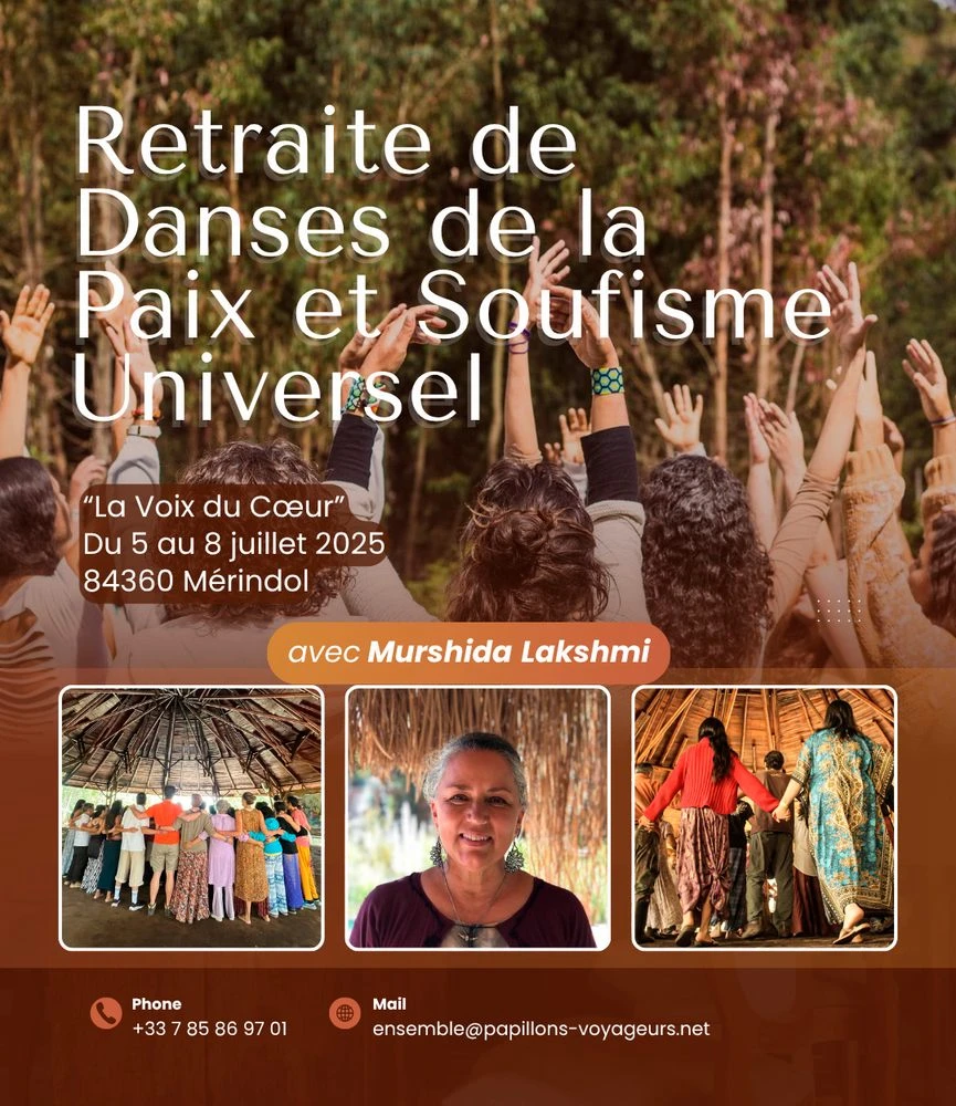 Nous t'invitons à vivre une retraite profondément humaine guidée par notre Murshida Lakshmi. Plus qu’un simple stage de danse, cette retraite propose une véritable quête spirituelle dans un cadre où l'ouverture de l'esprit passe par l'expérience non dogmatique de la réalité de chacun.e.
